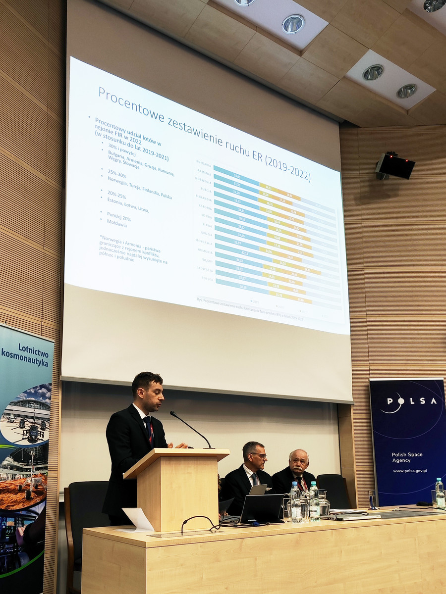 W tym znakomitym gronie specjalistów znaleźli się dr hab. inż. Tomasz Rogalski, prof. PRz oraz dr inż. Grzegorz Drupka, którzy w swoim wystąpieniu dokonali „Analizy zmian w ruchu lotniczym na przykładzie wybranych rejonów FIR europejskiej przestrzeni powietrznej po wystąpieniu konfliktu zbrojnego na terytorium Ukrainy w 2022 roku”. Naukowcy z Katedry Awioniki i Sterowania zaprezentowali, jak znaczące zmiany wystąpiły w ruchu lotniczym państw ościennych rejonu konfliktu. Wystąpienie zostało podzielone na dwa etapy. Podczas pierwszego etapu analizie poddano zmianę liczby lotów podczas fazy przelotu w wybranych rejonach informacji powietrznej FIR (Flight Information Region), w drugim określono zmiany w ruchu lotniskowym. Tym samym, analizie poddano przestrzeń powietrzną przynależną do 14 państw, rozpoczynając od północnej części kontynentu – od Norwegii po Armenię, w której zarejestrowano największy wzrost liczby lotów w stosunku do lat ubiegłych. Podczas oceny wzrostu ruchu lotniskowego zaobserwowano, że prym wiedzie lotnisko EPRZ Rzeszów–Jasionka, które w 2022 r. przyjęło ponad 25% więcej statków powietrznych na przestrzeni siedmiu lat 2017–2022. Dla porównania, kolejne miejsca zajmują lotniska w Wilnie (21%) i Antalyi (18%), co wskazuje na imponujące zmiany na podrzeszowskim lotnisku. Ponadto dla obu etapów określono średnią opóźnień i oceniono, że średnia przypadająca na lot wynika z charakteru operacji lotniczych w rejonach FIR oraz jest ściśle związana z pojemnością lotnisk.