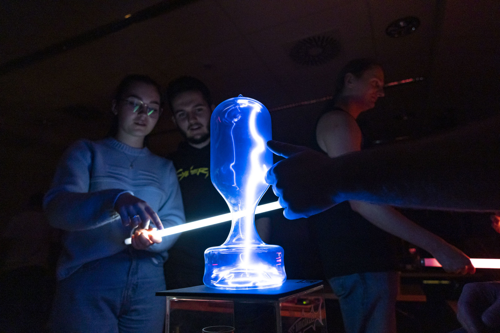 Najbardziej wyczekiwaną atrakcją Nocnych Spotkań z Nauką był „Teatr wysokich napięć”. Podczas spektaklu wykorzystany został jeden z największych w swojej klasie transformatorów Tesli. Był to niecodzienny widok kilkumetrowych wyładowań, które w rytm muzyki rozświetlały mrok.